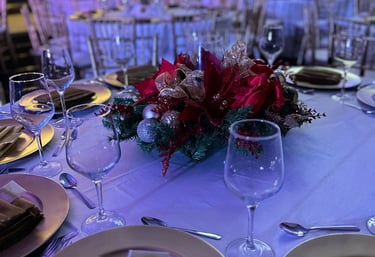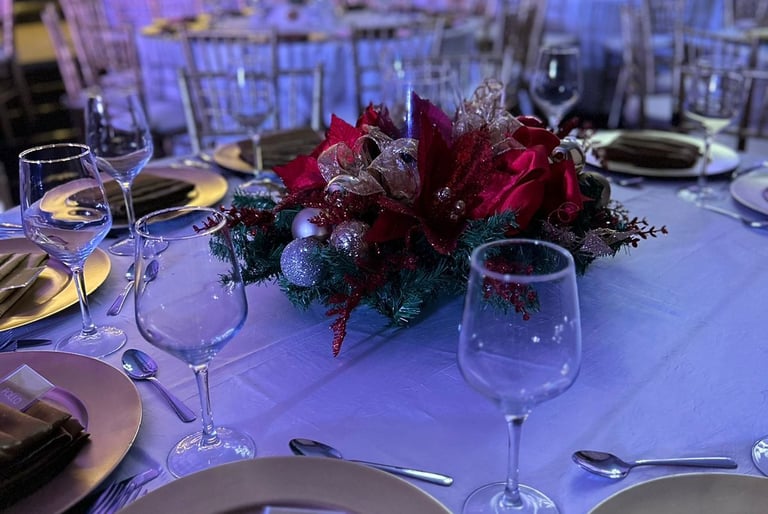 Mesas y sillas para 50 personas, mantel y centros de mesa navideños